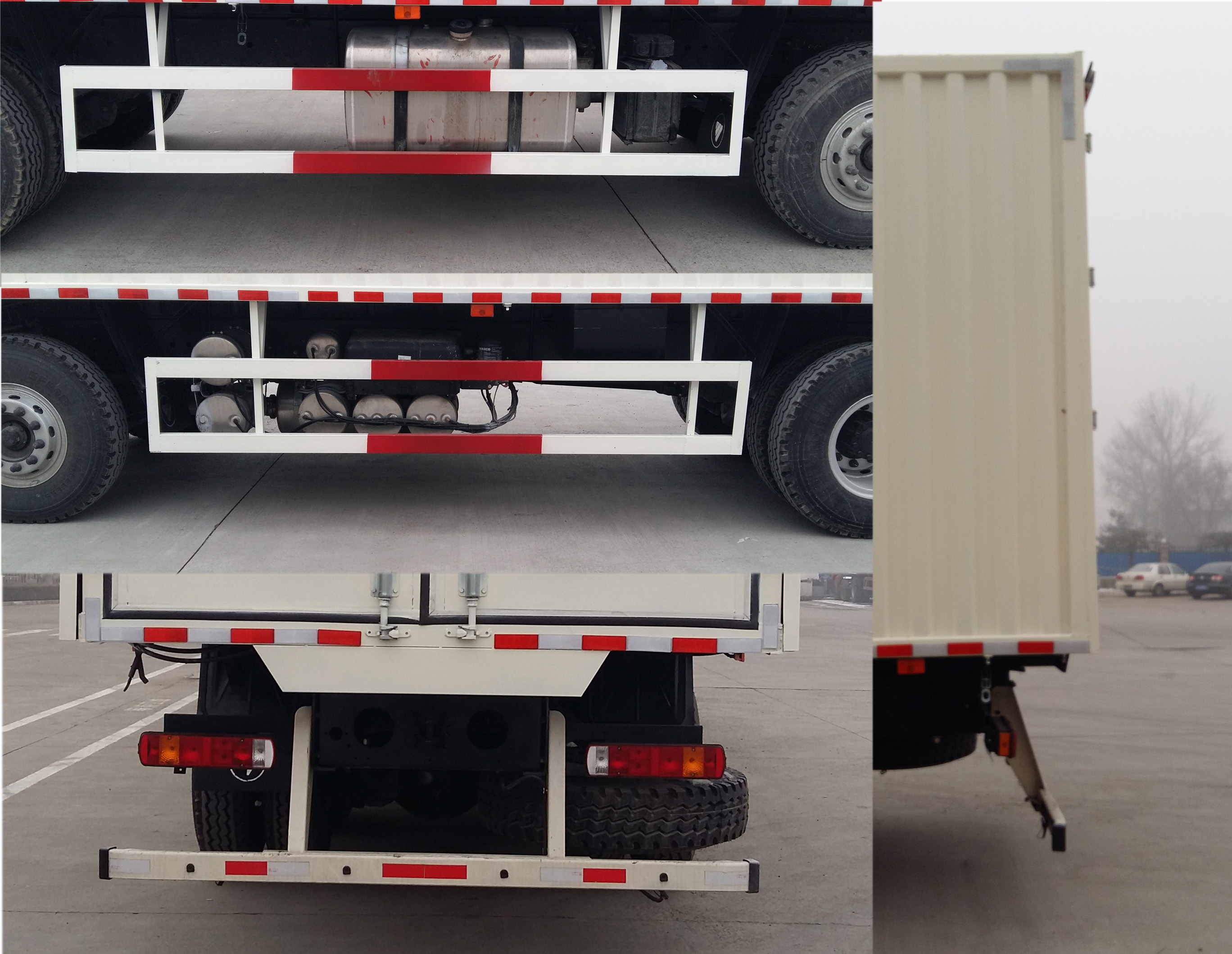 車(chē)廂頂部封閉不可開(kāi)啟.頂板與側(cè)翼板固定連接在一起可90度開(kāi)啟,選裝液壓尾板.尾板收起狀態(tài)的水平長(zhǎng)度為260mm,選裝平頂駕駛室,選裝導(dǎo)流罩.選裝前圍裝飾件及前部燈具,選裝不同形式貨箱結(jié)構(gòu).軸距1800+4700+1350對(duì)應(yīng)的前懸/后懸為1555/2595和1530/2620,軸距1800+4725+1300對(duì)應(yīng)前懸/后懸為1555/2620.軸距2000+4500+1350對(duì)應(yīng)的前懸/后懸為1555/2595,軸距2000+4525+1300對(duì)應(yīng)前懸/后懸為1555/2620.側(cè)防護(hù)裝置材料:Q235;后防護(hù)裝置材料:510L;后防護(hù)裝置斷面尺寸:100×50mm,后防護(hù)離地高度:500mm;側(cè)防護(hù)裝置連接方式:螺栓連接,后防護(hù)裝置連接方式:螺栓連接.ABS系統(tǒng)控制器型號(hào):3550X-1010,ABS生產(chǎn)企業(yè):東風(fēng)電子科技股份有限公司.安裝具有衛(wèi)星定位功能的行駛記錄儀.發(fā)動(dòng)機(jī)ISGe5-380,ISGe5-360,ISGe5-340,ISGe5-320,ISGe5-300,ISGe5-280,ISGe5-400,SC9DF320Q5,SC9DF340Q5,SC9DF360Q5對(duì)應(yīng)油耗申報(bào)值為40.8L/100km. |