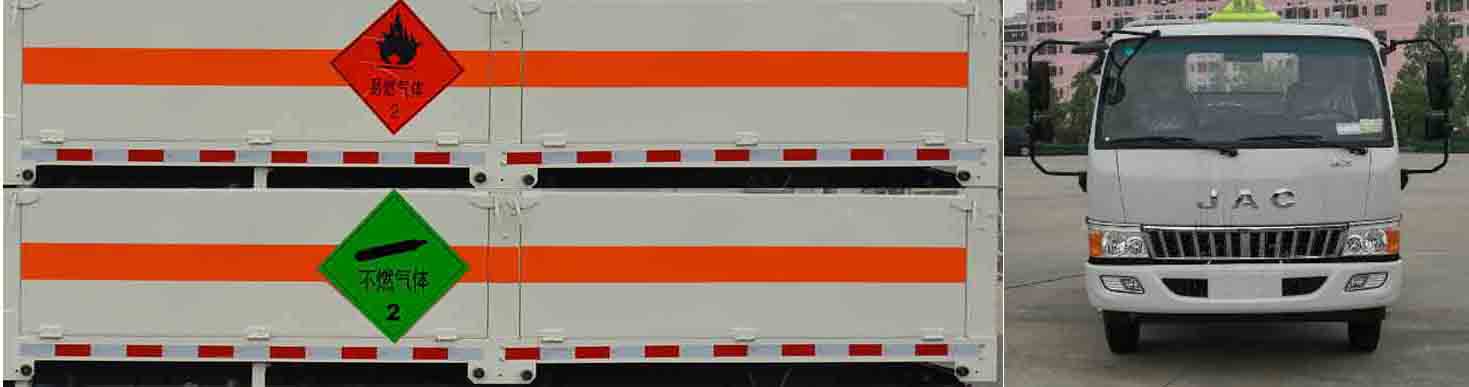 江淮駿鈴E6欄板式氣瓶運輸車為廂體選裝無柵欄.運輸具有獨立罐(瓶)容器包裝的易燃氣體:液化石油氣,壓縮天然氣,乙炔,乙烷,丁烷,丁烯,丙烯.甲烷.二甲醚,壓縮氫.類項號2.1,運輸具有獨立容器包裝的非易燃無毒氣體:二氧化碳,壓縮氧. 壓縮空氣(氮,氦,氬,氖),類項號2.2,該車運輸的氣瓶盛裝介質2.1項易燃氣體時,車輛左、右側及后部粘貼“易燃氣體”標示牌,該車運輸的氣瓶中盛裝介質2.2項非易燃無毒氣體時,車輛左、右側及后部粘貼“不燃氣體”標示牌.廂體顏色可變化.側面及后下部防護裝置材料為Q235,與車架采用焊接連接.后下部防護裝置斷面尺寸(mm):120×50,離地高度:490mm。選裝液壓升降尾板,選裝液壓尾板時收起狀態的水平長度為300mm,僅采用排氣管前置、子午胎,限速裝置,輔助制動裝置和前盤制動器的底盤;限速80km/h.。