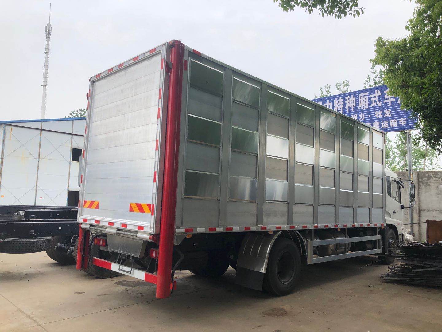 東風天龍前四后八全鋁畜禽運輸車/運豬仔車采用東風商用車公司底盤,雷諾420馬力,法士特12檔,1100R20輪胎,電動門窗,中控鎖,ABS,方向助力,空調等。上裝配置: 箱體為全鋁保溫結構,三層,混合隔倉,可開合側窗,高轉速防水通風排氣扇,機組,噴淋,喂食,監控,垂直升降尾板。具體功能如下: