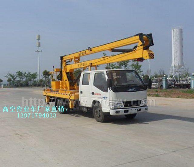 江鈴曲臂式國五高空作業車采用雙排座江鈴國五二類底盤,JX493ZLQ5A江鈴85KW發動機,7.00-R16LT 10PR輪胎,前伸970mm,后伸100mm,帶液壓或手動支腿4個。