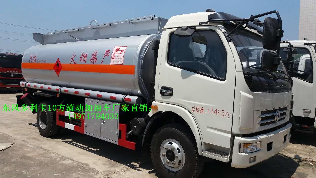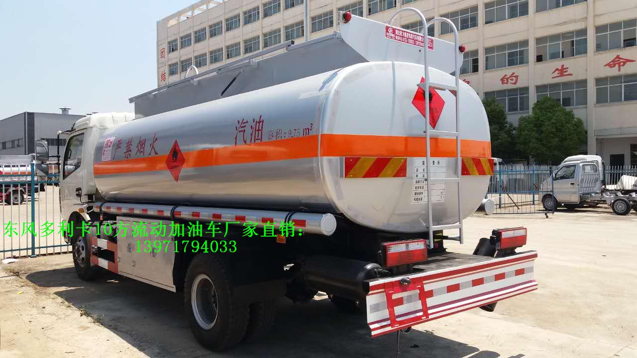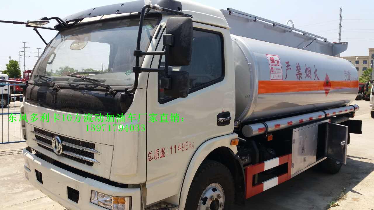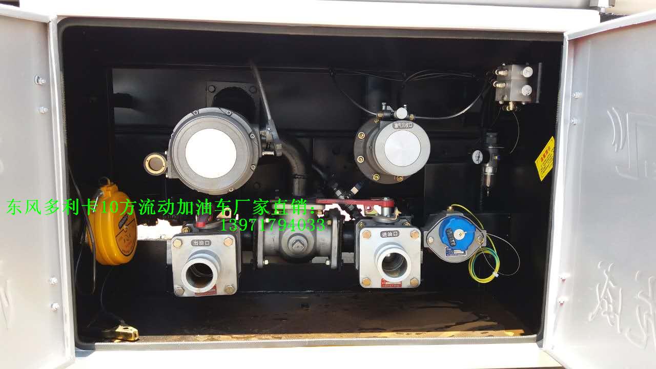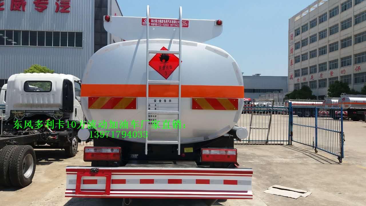 東風多利卡10方國五流動加油車客戶選裝配置:優質鋁合金球閥(閥門) ;可分倉(附加一套歐標罐口及海底閥) ;泵進/泵出流量表(合肥流量表/重慶流量表),罐體內部襯塑或罐體內部防腐油漆,升降走道板(保護罐口).選裝加油機倉內或外裝大梁。