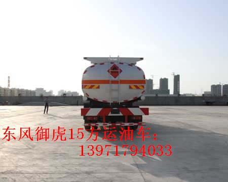 東風御虎15方國五單橋運油車客戶選裝配置:優質鋁合金球閥(閥門) ;可分倉(附加一套歐標罐口及海底閥) ;泵進/泵出流量表(合肥流量表/重慶流量表),罐體內部襯塑或罐體內部防腐油漆,選裝加油機倉內或外裝大梁。