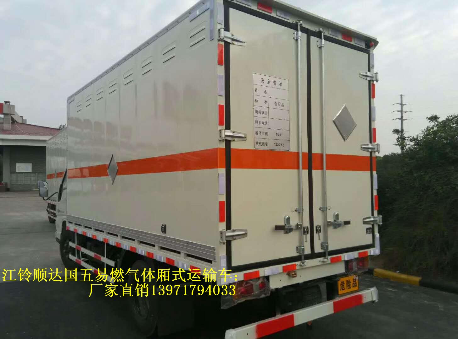 江鈴順達國五易燃氣體廂式運輸車運輸具有獨立容器(瓶)包裝的易燃氣體:液化石油氣,原油氣,壓縮天然氣,乙炔,甲烷,乙烷,丙烷,丁烷,丙烯,丁烯,二甲醚,打火機或打火機加油器(裝有易燃氣體),壓縮氫,類項號:2.1;運輸具有獨立容器(瓶)包裝的非易燃無毒氣體:液化氣體(非易燃,充有氮,二氧化碳或空氣),壓縮氧(氮,空氣,氦,氬,氖),二氧化碳,類項號2.2;該車為危險品貨物運輸車;廂體選裝瓦楞板結構,廂體側面選裝開門型式及位置或不帶側開門,選裝百葉窗,廂體顏色可變化,選裝液壓升降尾板(收起狀態水平長度為290mm)。