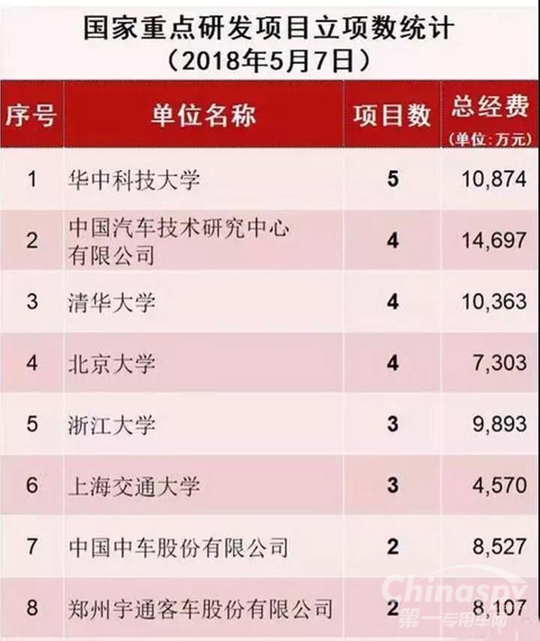 本次公布的擬立項項目總數(shù)共128個,總經(jīng)費超過31億元。其中,51個項目由高校牽頭,占比接近40%,其余項目由科研單位、企業(yè)等牽頭。 值得一提的是,在“新能源汽車”重點專項中,共有25項擬立項項目,總金額為8.2億元。其中,鄭州宇通客車股份有限公司牽頭承擔(dān)的有2項,分別為《燃料電池公交車電—電深度混合動力系統(tǒng)平臺》(5282萬元)、《高性價比商用車混合動力系統(tǒng)開發(fā)與整車集成》(2825萬元),總金額達到了8107萬元。同時,鄭州宇通集團有限公司有1項,項目名稱為《高安全長壽命客車動力電池系統(tǒng)關(guān)鍵技術(shù)研究》,金額為4805萬元。此外,鄭州宇通重工有限公司也有1項,項目名稱為《N2/N3類純電動商用車動力平臺關(guān)鍵技術(shù)研究》,金額為2193萬元。這意味著宇通集團總的擬立項數(shù)達到了4項之多,占比近1/6,立項數(shù)與中國汽車技術(shù)研究中心有限公司相同,并遙遙領(lǐng)先于其他汽車企業(yè),總經(jīng)費也高達1.51億元,占比18.4%。