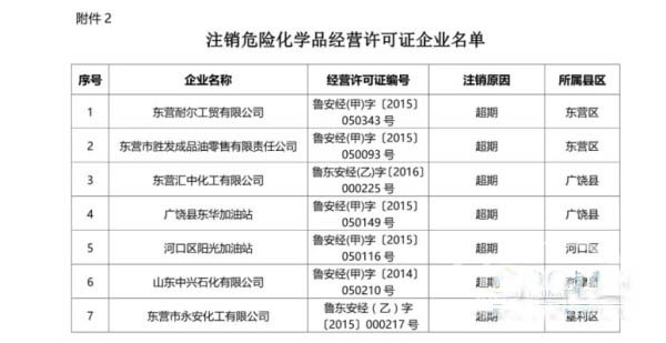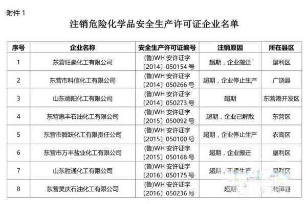 今日從山東省東營(yíng)市應(yīng)急管理局官方網(wǎng)站了解到,東營(yíng)旺豪化工有限公司等15家危險(xiǎn)化學(xué)品企業(yè)許可證被注銷(xiāo)。具體注銷(xiāo)企業(yè)名單如下: