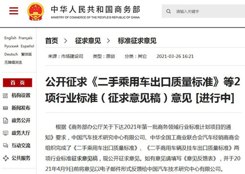 《商務部辦公廳關于下達2021年第一批商務領域行業標準計劃項目的通知》要求,中國汽車技術研究中心有限公司、中華全國工商業聯合會汽車經銷商商會組織完成了《二手乘用車出口質量標準》、《二手商用車輛及掛車出口質量標準》兩項行業標準征求意見稿,現公開征求意見。如有意見請填寫《意見反饋表》,并于2021年4月9日前將意見以電子郵件形式反饋給中國汽車技術研究中心有限公司。