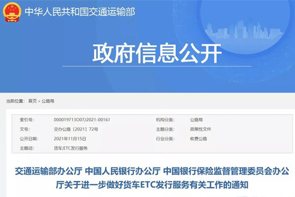 截至2021年9月底,全網ETC平均使用率已超過66%,高速公路網通行效率大幅提升。特別是2021年以來,貨車ETC使用率持續提升,但部分地區仍存在貨車ETC難辦理等問題。為切實解決該問題,保護貨車司機合法權益,促進物流降本增效,交通運輸部聯合中國人民銀行、中國銀行保險監督管理委員會發布通知,要求各地進一步做好貨車ETC發行服務。