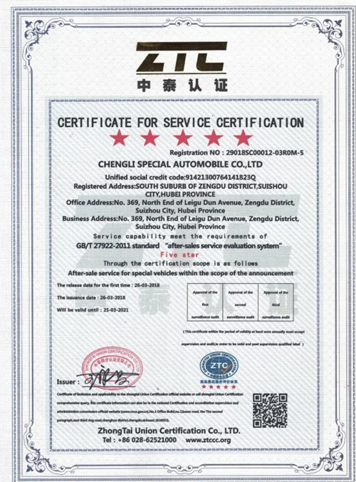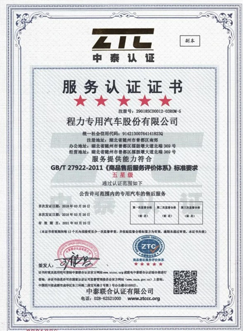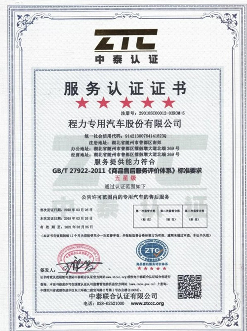程力汽車(chē)集團(tuán)五星級(jí)售后服務(wù)認(rèn)證的證書(shū)如下:
