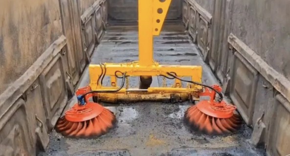 隨著我國“一帶一路”戰略的實施推廣,我國沿海港口的貨運量不斷增加,煤炭和礦石等散裝物料經海運到港后主要通過火車運往內陸各地,因火車貨廂的散裝物料經翻車機或卸料設備卸料后車廂內都會剩余較多的余料,所以,為避免不同貨料混摻,客戶要求空火車車廂在裝料前需要清掃干凈。