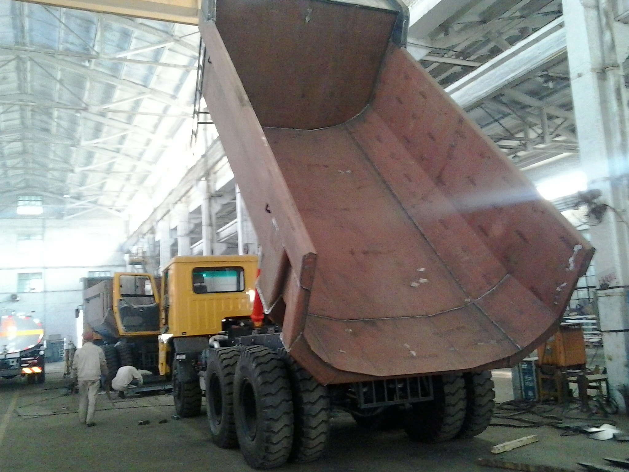 該礦用車U型斗設計.尾部上翹10度,可承載50噸左右礦石原料.由悍達鋼板制造的礦用車箱焊接點少,車輛自重減輕了3至4噸.同等載重下更節約油料,降低輪胎磨損.
